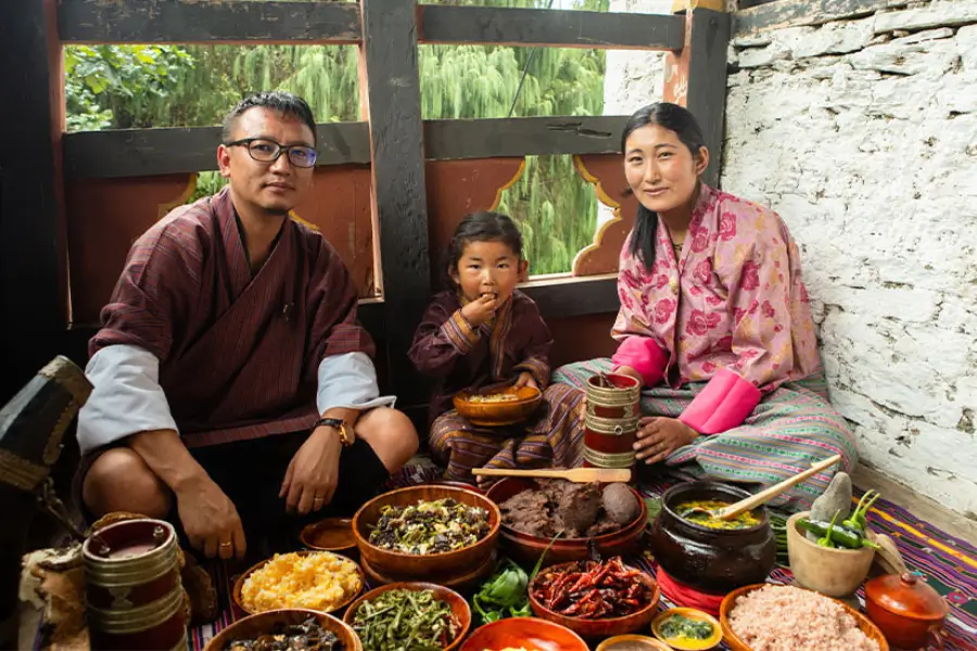 Ẩm thực trong ngày đầu năm của Bhutan phản ánh đúng tinh thần của một quốc gia coi trọng sự thanh tịnh và cân bằng. Trên bàn ăn, thường không có các món cầu kỳ hay xa hoa, thay vào đó là những món dân dã mang ý nghĩa biểu tượng. Ema Datshi – món ớt nấu phô mai nổi tiếng – tượng trưng cho sự ấm áp và sức mạnh tinh thần. Cơm đỏ Bhutan, loại gạo đặc trưng của vùng Himalaya, đại diện cho sự đủ đầy và sung túc.