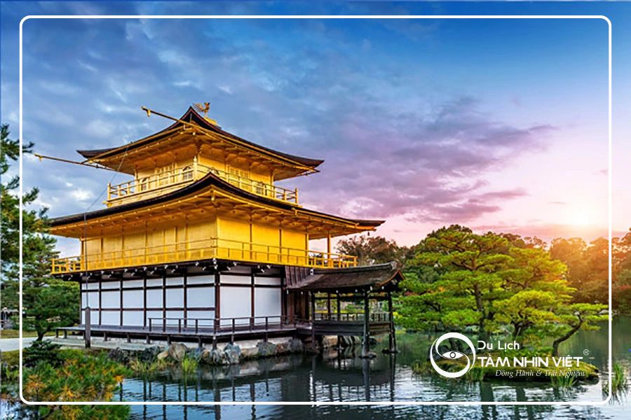 Nổi tiếng tại cố đô Kyoto, lại được ôm trọn bởi thiên nhiên xanh thẳm, mát rượi, đền Kinkaku-ji ở Kyoto là một công trình kiến trúc nổi tiếng vô cùng. Ngôi đền vàng này có 3 tầng mang ba phong cách kiến trúc, văn hóa khác nhau gồm Shinden, Bukkle và Trung Hoa, phía trước lại có một hồ nước điều hòa giúp cho khí hậu xung quanh trong lành, thanh mát.Vào mùa đông, khi những bông tuyết rơi nhẹ, cảnh sắc xung quanh ngôi đền sẽ đẹp như một bức tranh, thu hút mọi ánh nhìn. Đền Kinkaku-ji ở Kyoto với một không gian thanh tịnh, trang nghiêm, ấm áp chắc hẳn sẽ làm du khách cảm thấy vô cùng thư thái khi đặt chân đến đền Kinkaku-ji.