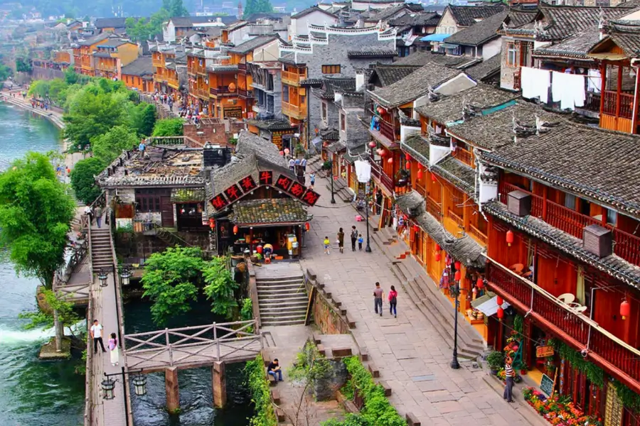 - Phượng Hoàng Cổ Trấn với lầu Miêu Miêu, Bắc Môn cổ thành, Lầu phong Thúy Hồng Kiều, Viện Bảo Tàng Cổ Thành (tham quan bên ngoài). Khám phá vẻ đẹp từ những viên đá cũ kĩ của tường thành đến những mái ngói xô nghiêng, mộc mạc giản dị với những con thuyền và người lái đò lặng trôi trên dòng Đà giang xanh màu ngọc bích tới những xúc cảm da diết lắng đọng như muốn níu giữ những chiếc lá vàng óng lững lờ trôi qua. Cảm giác được thưởng ngoạn từ cầu Hồng Kiều phóng tầm mắt ngắm trọn dòng Đà giang như khi xưa vua chúa hay trộm nhìn mỹ nữ tắm dễ làm ta tức cảnh sinh tình. Con người nơi đây ngàn đời gắn trọn với bao đổi thay của đất trời thời đại, với bao nét văn hóa ngoại lai giao thoa mỗi ngày đã tạo lên điều huyền bí và lung linh như Phong Hoa.