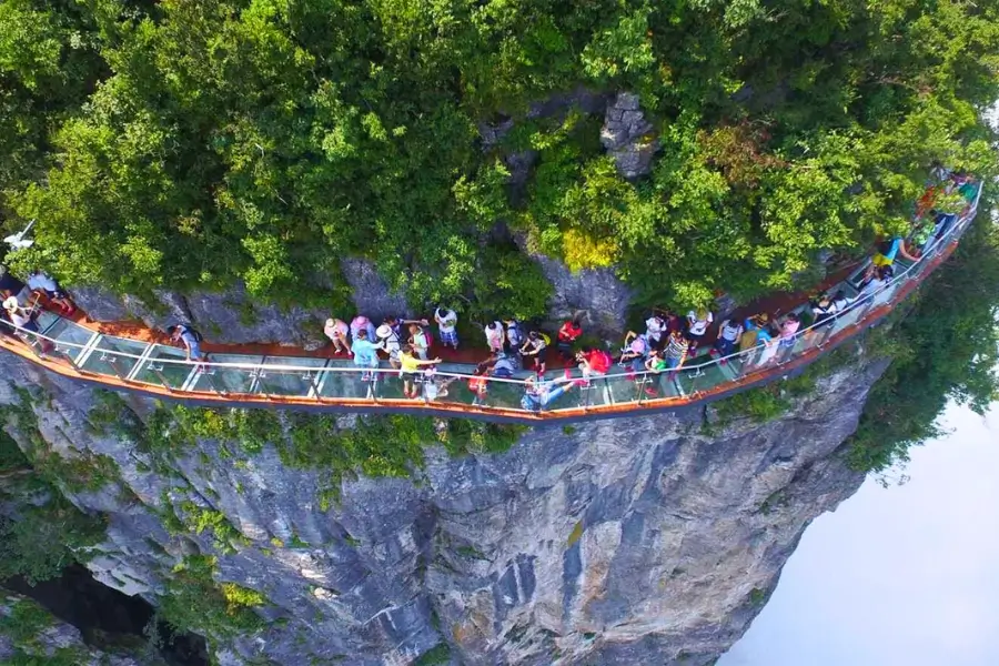 - Trải nghiệm Sạn Đạo Kính (Cầu kính - con đường gác kính trên vách đá), con đường làm từ những tấm kính cường lực trong suốt, dày hơn 6cm. Con đường men theo vách núi dựng đứng, Skywalk đã trở thành một trong những điểm thu hút khách du lịch hấp dẫn nhất tại Trương Gia Giới.